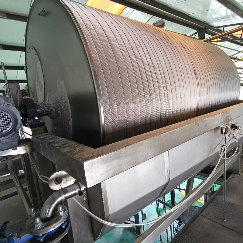 The porous surface of the rotating drum is covered with a layer of filter cloth, with a support screen installed between the filter cloth and the porous shell. The rotating drum passes through the filter tank, and a negative pressure is formed inside the drum by the vacuum pump. Moisture in the starch milk passes through the filter cloth into the drum, while starch granules cannot pass through and remain on the surface of the rotating drum. The pneumatic scraper removes the starch granules, which are then conveyed by belt conveyor to the next process.
